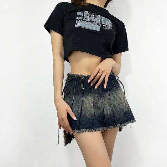 Sexy Denim Skirt Women Summer All-Match Distressed Frayed Edge High Waist with Straps Pleated Skirt