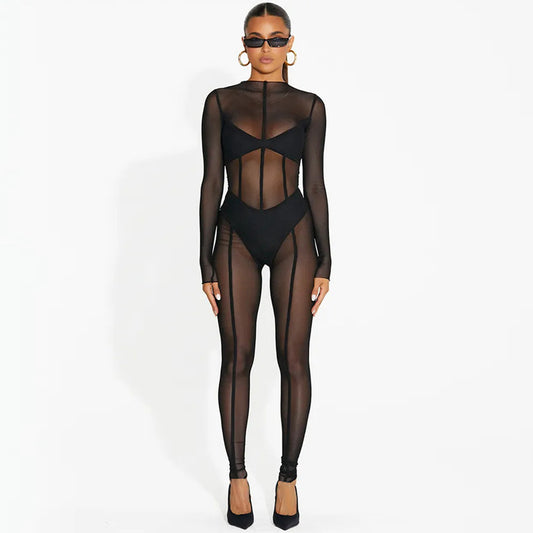 Long Sleeve Mesh Trousers Autumn Women Clothing Sexy See through Jumpsuit