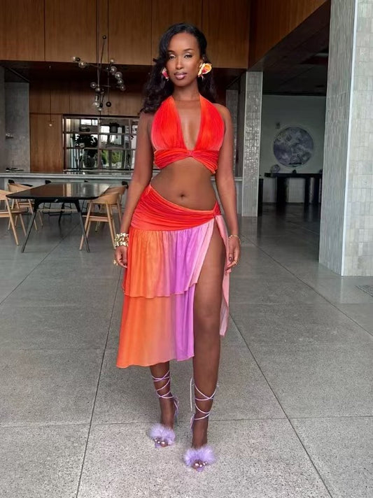 Women Clothing Supply Sexy Swing Collar Backless Halter Slim Printed Skirt Two Piece Sets