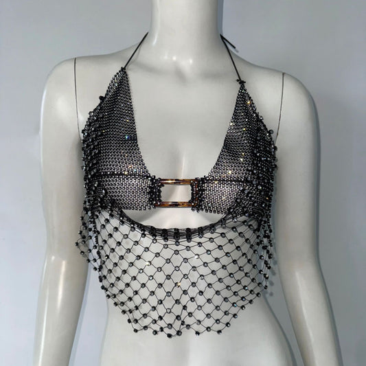 Sling Girls Sexy Suspenders Fishnet Rhinestone Halter Top Music Festival Camisole