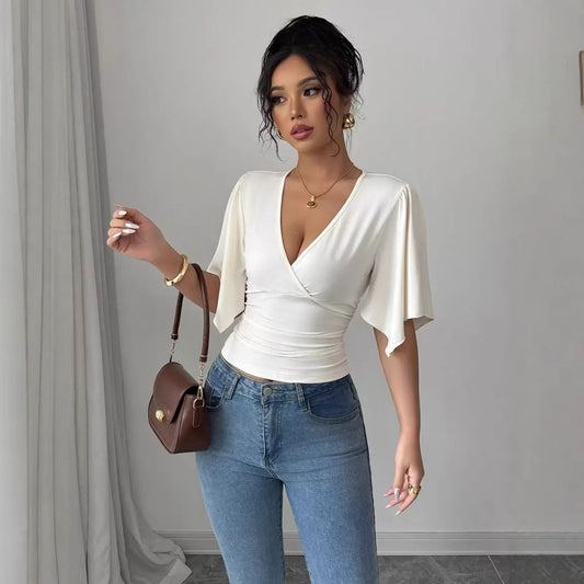 Summer Slim Fit Cross V neck Pleated Pullover Bell Sleeve Solid Color T shirt