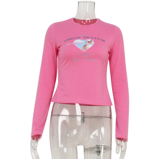 Spring Summer Pink Sweet Girl Girlish Tight Long Sleeve Cute Printed Sexy Sexy Top