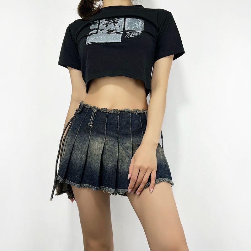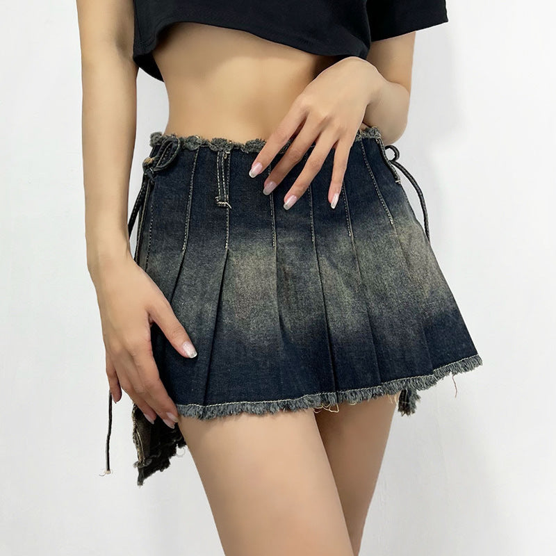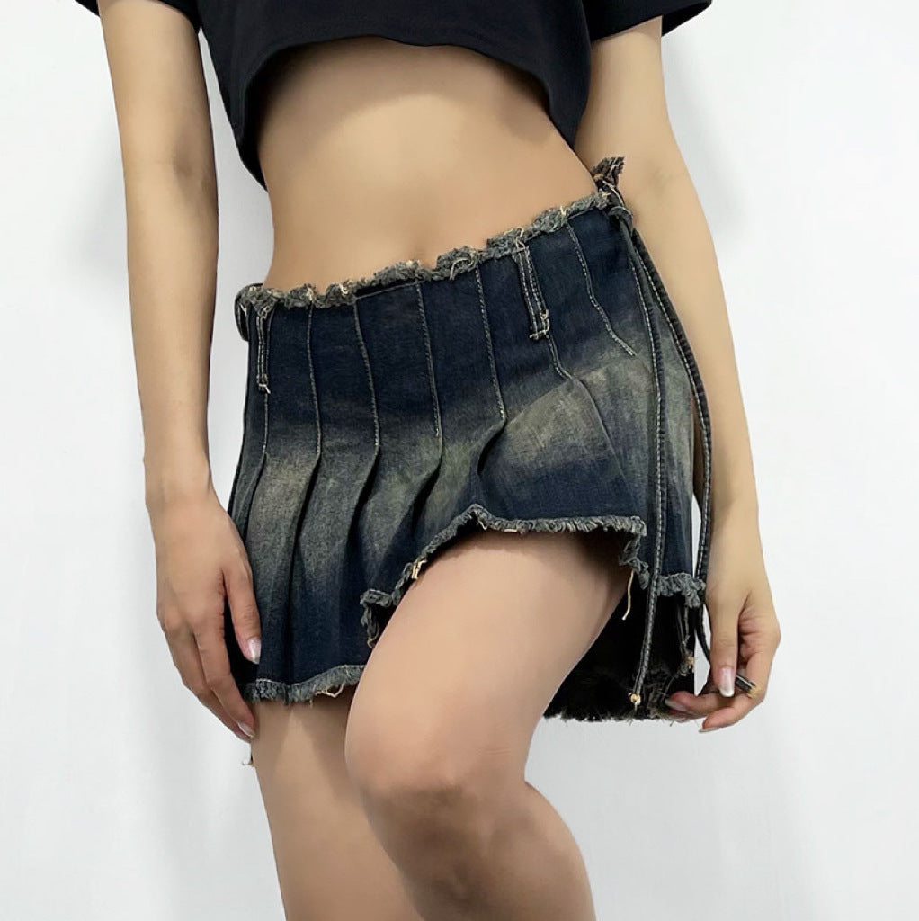 Sexy Denim Skirt Women Summer All-Match Distressed Frayed Edge High Waist with Straps Pleated Skirt