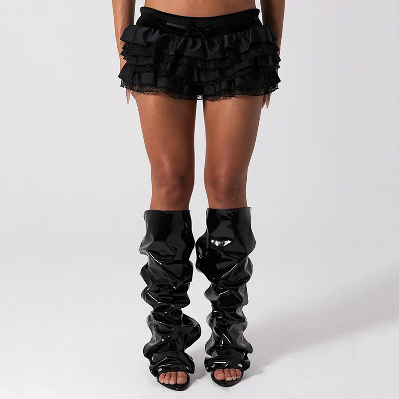 Sexy Street Sexy Skirt Solid Color Satin Stitching Multi Layer Tiered Dress Low Waist Skirt
