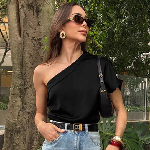 Spring Summer Irregular Asymmetric Collar Matte Satin off the Shoulder T shirt Top for Women