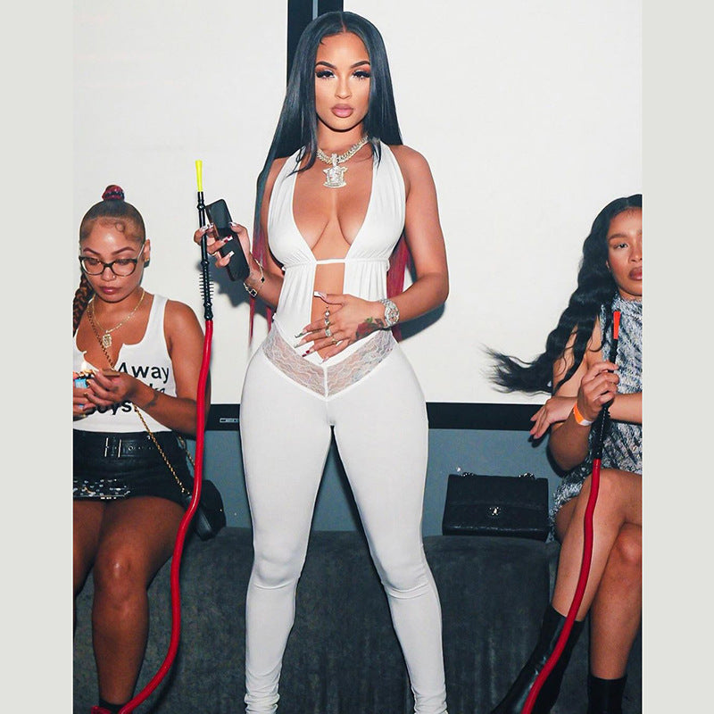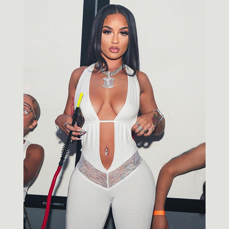 Summer Women Sexy Halter Deep V Plunge neck Backless Lace Hollow Out Cutout Slim Trousers Jumpsuit