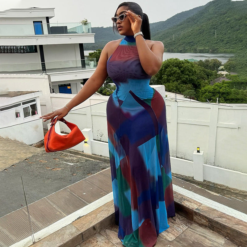 Women Clothing Printed Waist Controlled Pleated Hip Skirt Mesh Stand Collar Sleeveless Color Matching Length Dress
