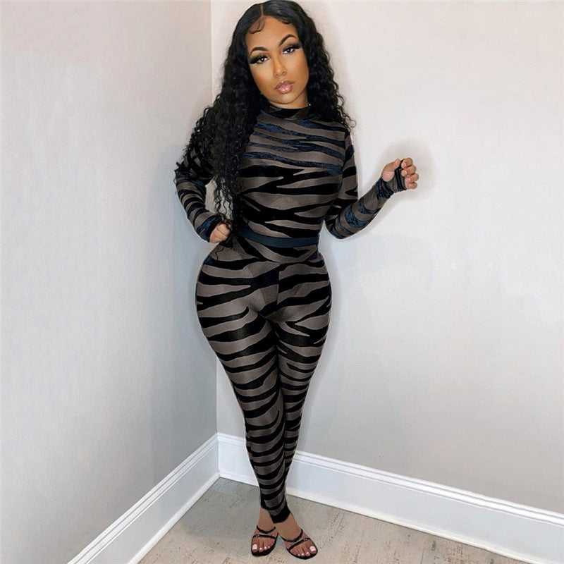 Women Clothing Striped Printed Sheer Mesh Sexy Jumpsuit