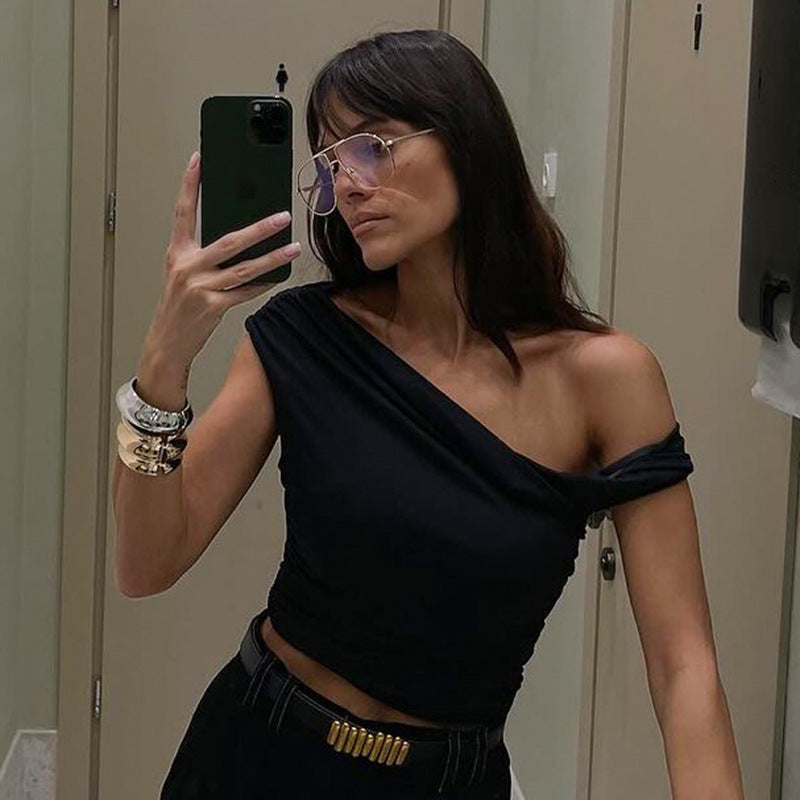 Women Clothing Summer Sexy One Shoulder Cold Shoulder Twist Design Pleated Slim T shirt