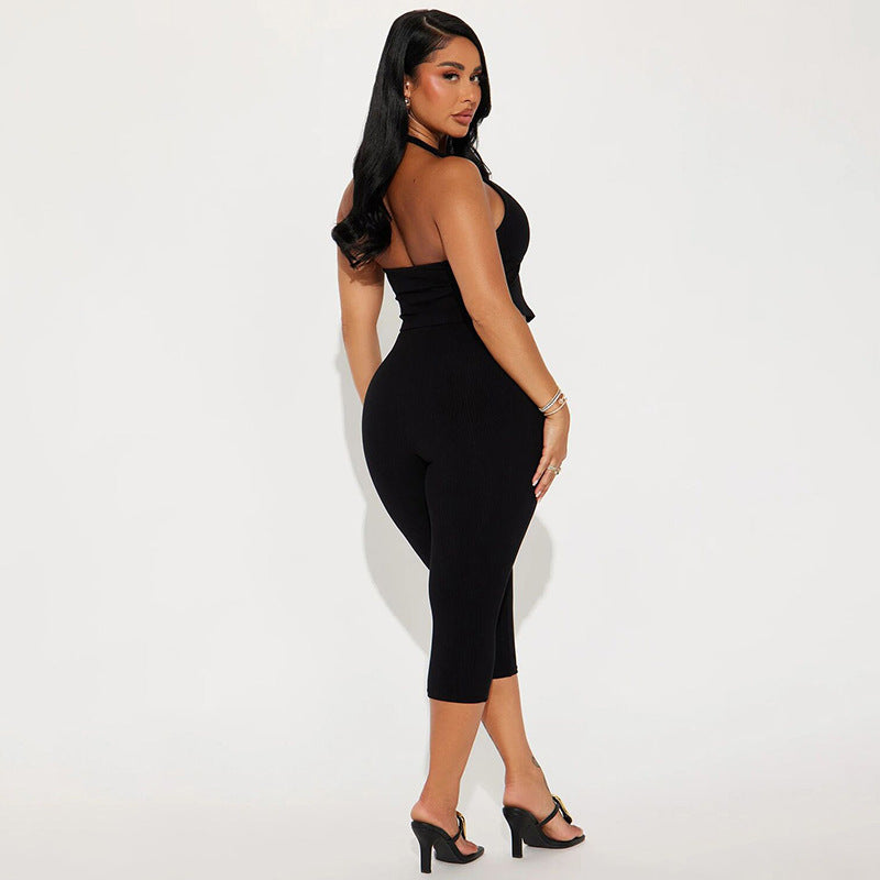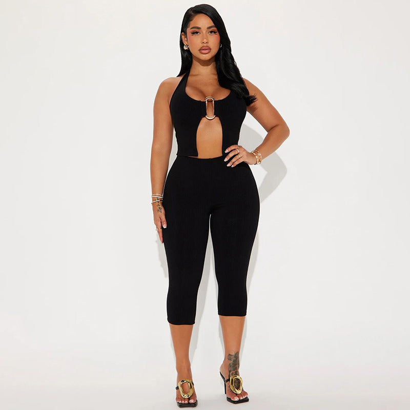 Women Spring Summer Metal Buckle Hollow Out Cutout out Halter Rope Bare Back Low Waist Hip Wrapped Set